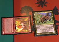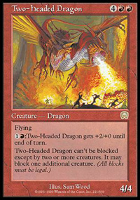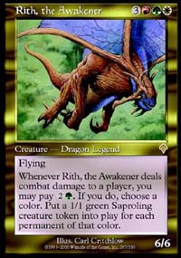 | Two-Headed Dragon. It's time to bring in the big guy. Who would have guessed that my big tech for a PT would be Two-Headed Dragon? It was Seth Burn who came up with the idea. He came up with the idea while I was at the Magic Invitational. So I got back and suddenly there are eight heads in the deck! It took a moment before I realized he was serious. After testing them, it became clear they were amazing. What does the Dragon do? What doesn't it do? It even double blocks, which is something that should never be mentioned until it actually happens. A lot of players will forget. When it doesn't have to play defense, and it almost never does, it's very difficult to block. Rith gets blocked forever by a lowly Thermal Glider, but almost no one has two of those. In the mirror matchup, it moves from a minor edge for this version (due to size) into a big advantage outside Rhystic Lightning, since if we could stall the Dragon would come and win the game. In other matchups it was similar. When it came out, it just won the game in short order. For a while there were four, then I made it two and two in the sideboard because of mana curve issues - extending the curve to six spreads it pretty thin. Then it came back to three when the sideboard tightened up and I stopped wanting the fourth that much anyway. The Dragon serves a few other purposes. It blocks Blinding Angel, goes over Evil Eye of Orms by Gore (don't laugh, they're out there), it's unaffected by Teferi's Moat and it takes a separate Story Circle to deal with it (since most players will correctly name green against Fires). |    | Rith, The Awakener. Then there's the other dragon. Rith has one big advantage over Two-Headed Dragon, which is that if it deals damage against another green deck the opponent will need a Dragon or a Simoon/Quake to stay in the game. The other advantage is that for the three-color versions, Two-Headed Dragon would be too painful to pump and Rith is actually easier to cast. If the mana isn't there for two heads, then I guess the deck has to go with one. Rith has a lot of issues, though. Its ability is nice but mostly redundant against most non-green decks. It only hits for six damage, which isn't too shabby but not in the Dragon's range. Finally, and this is big, Rith gets blocked! Birds of Paradise buys a turn, Thermal Glider buys a lifetime and even Defiant Falcon keeps hope alive. Rith needs Armadillo Cloak to make its dreams really come true. | | ---------------------------------------------------------------------------------------------------------------------------------------------------------------------------------------------------------------------------------------------------------------------------------------------------------------------------------------------------------------------------------------------------------------------------------------------------------------------------------------------------------------------------------------------------------------------------------------------------------------------------------------------------------------------------------------------------------------------------------------------------------------------------------------------------------------------------------------------------------------------------------------------------------------------------------------------------------------------------------------------------------------------------------------------------------------------------------------------------------------------------------------------------------------------------------------------------------------------------------------------------------------------------------------------------------------------------------------------------------------------------------------------------------------------------------------------------------------------------------------------------------------------------------------------------------------------------------------------------------------------------------------------------------- | ----------------------------------------------------------------------------------------------------------------------------------------------------------------------------------------------------------------------------------- | ---------------------------------------------------------------------------------------------------------------------------------------------------------------------------------------------------------------------------------------------------------------------------------------------------------------------------------------------------------------------------------------------------------------------------------------------------------------------------------------------------------------------------------------------------------------------------------------------------------------------------------------------------------------------------------------------------------------------------------------------------------------------------------------------------------------------------------------------------------------------------------------- |