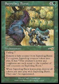** Aura Mutation **. Then there are those who get greedy. Gone is the insurance of a backup ability against decks without enchantments or when no white mana is available. Unlike Wax and Wane, Aura Mutation will be a dead card a significant portion of the time. That's the bad news. The good news is that when Aura Mutation works it is devastating, sufficiently so against other Fires decks that it drove my whole team crazy in testing. Not only does it take out Saproling Burst for only two mana, it creates five bonus 1/1 tokens. The tokens mean that Mutation is never a purely dead card against any deck; a used up or about to be killed Saproling Burst can be turned into five tokens, and sometimes Fires can be turned into three. This gets most annoying when a control player finally gets tired of holding removal and tries to kill one. The bottom line on Aura Mutation turned out to be that it was great but a worse maindeck card than Wax and Wane for W/G decks and for Fires decks. As a sideboard card it suffers because of Simoon and because of opponents playing around it, especially by focusing in on the white mana. It's still worthwhile for those with white mana, but I don't think the white mana is worth it.