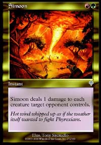 ** Simoon **. Our team missed it for the Pro Tour, but since then it has come to my attention that this is the proper sideboard card for the mirror. There are three basic plans to try and win the mirror matchup. One is Aura Mutation , with the plan being to take out the opponent's Saproling Bursts with a profit, then ride that advantage to victory. That strategy is better than nothing, but misses the point and is often easy to play around. The other two are Simoon and Tangle , both of which are reasonable. Simoon wins out, in large part because it is far more useful against other deck types. It can come in against Rebels, it can come in against W/G, it wrecks blue skies decks the deck would otherwise have no sideboard against. Tangle was basically just for other decks with Blastoderms and Saproling Bursts. Simoon also benefits from opponents continuing to run River Boa and often 'cheating' on the land. If a Dust Bowl version is facing less than 24 lands, Simoon can make mana disruption into plan A. Don't be afraid of "wasting" Simoon on a 1-for-1 trade to mana lock an opponent, but when possible try to get two (or even more) for one with it. I recommend four copies.