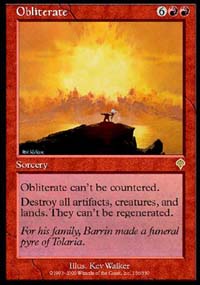 ** Obliterate **. Ka-boom! Blowing up the world has never been so reliable, but it's also rarely been so expensive. Drawing Obliterate before its time is virtually the same as a mulligan until it finally starts to matter. The majority of the time, Obliterate will sit in hand and do absolutely nothing. That by itself is a good reason the deck only uses one in its sideboard. In exchange for that, it will win games no other card could have won. Often it will take a completely and utterly lost game and turn it into one that the opponent cannot win. If it's going to get used, it's vital to be prepared. After the world blows up, the next turn should be Forest (or even better against blue, Karpulsian Forest ) and Llanowar Elves or Birds of Paradise . The next turn should be land and Idol, or Port to set up bigger creatures later on. Wait as long as possible before pushing the button. When playing Obliterate , it should basically be ignored as a dead card, with the exception of placing a higher value on the one time tapping of Rishadan Port and Dust Bowl under Tsabo's Web if Obliterate is already in hand. That only changes when the game has gone sufficiently poorly that the plan shifts to Obliterate . At that point, cards are hoarded in hand, lands and mana creatures are carefully rationed and threats are discarded rather than cast to make sure they are not exposed. Be warned, if it gets to that point the opponent will probably know what's coming and likely have a Thwart in reserve.