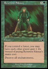 On to sideboarding. Against W/U, Reverent Silence has to come in, as do the other two Kavu Chameleons and Obliterate . That means taking out five cards. Three of those cards are Assault and Battery, because they're a very inefficient creature. The last two may come as somewhat of a surprise, because the deck sideboards out two Blastoderms. Blastoderm does actually have a serious 'take 15' problem against W/U even more than other control decks, because of Absorb . That makes it a worse card than Jade Leech , together with issues with Reverent Silence (gain 6?) and Story Circle and Teferi's Moat . The game plays differently after sideboarding to some extent, and to that extent the Fires side is generally better off. Story Circle is no longer permanent, Kavu Chameleon goes through both that and Teferi's Moat and can't be countered. Even if U/W gets out of the opening, Kavu Chameleon can still force him to produce Wrath of God in a hurry. Finally, about one game in three there will be time to draw into the ace in the hole, Obliterate . A proper hand for recovery will smash any hand the U/W deck can have, even if they're protected by enchantments.